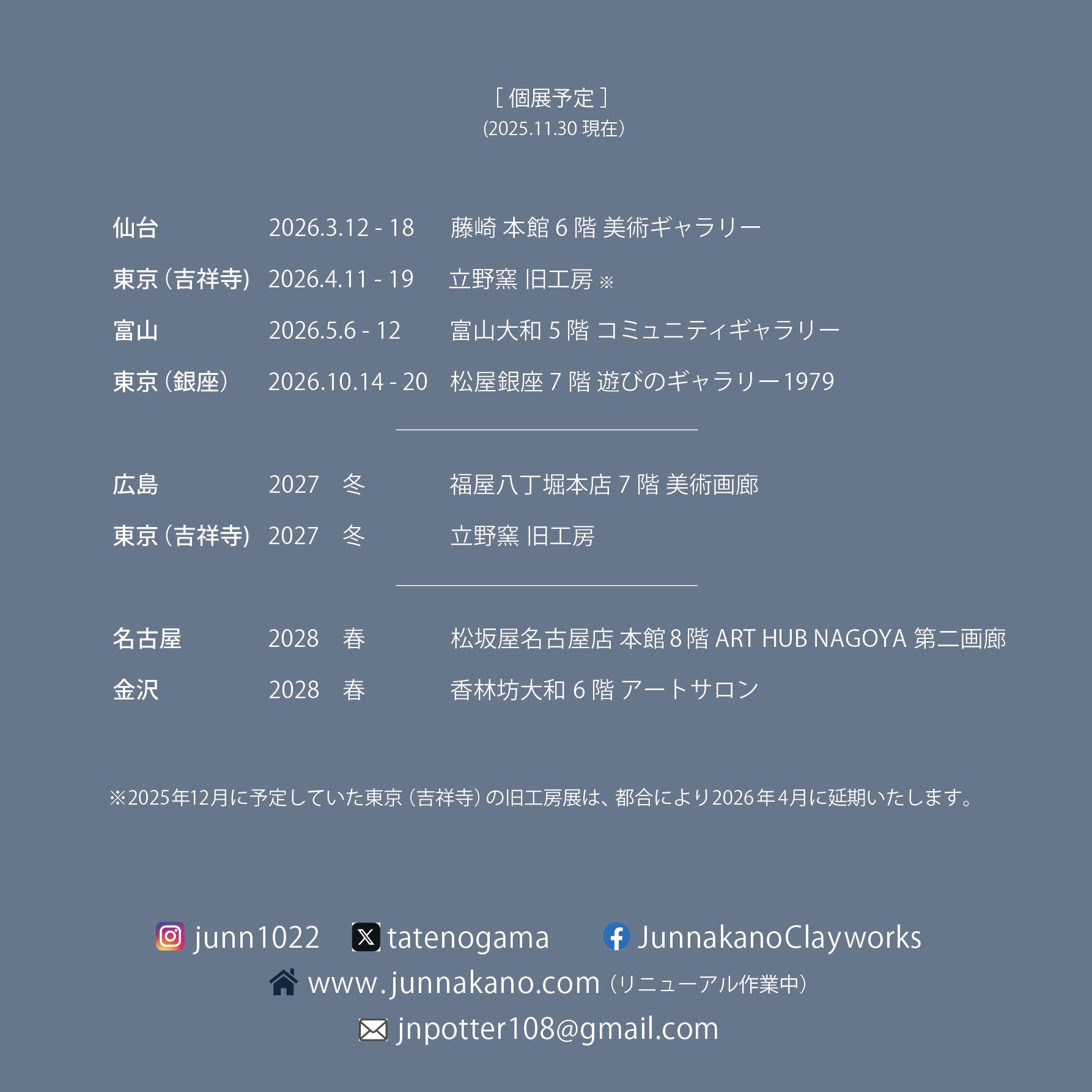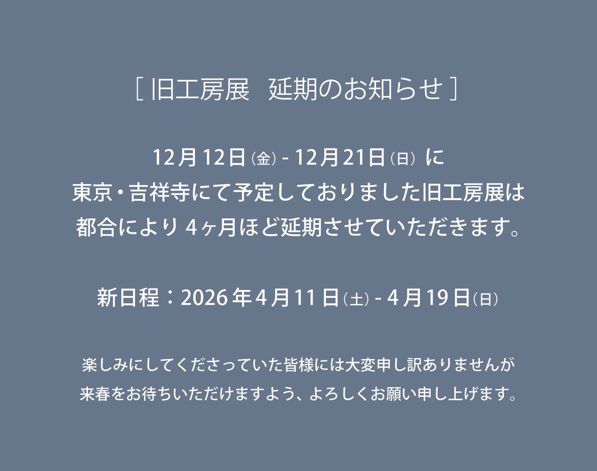 2025年12月に予定しておりました東京(吉祥寺)の旧工房展は、都合により2026年4月に延期しました。